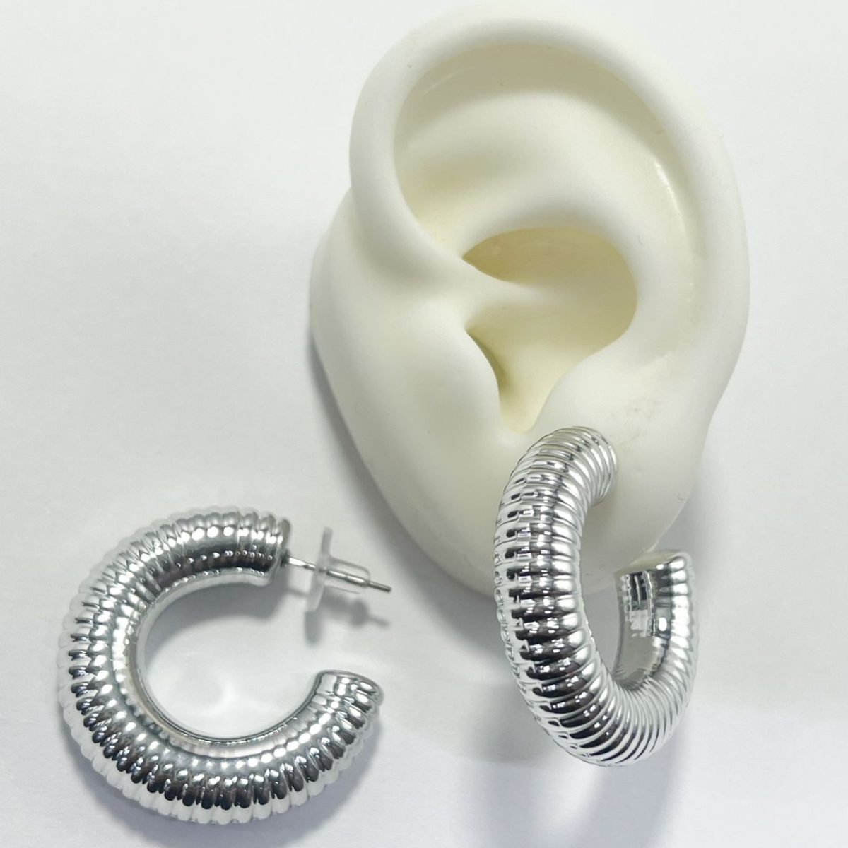 Estos aretes en material ABS/Plasti Metal combinan ligereza y durabilidad, ofreciendo un diseño moderno y versátil para cualquier ocasión. Su acabado suave y brillante añade un toque chic a tu look, mientras que su estructura liviana los convierte en la opción ideal para llevar todo el día con comodidad.