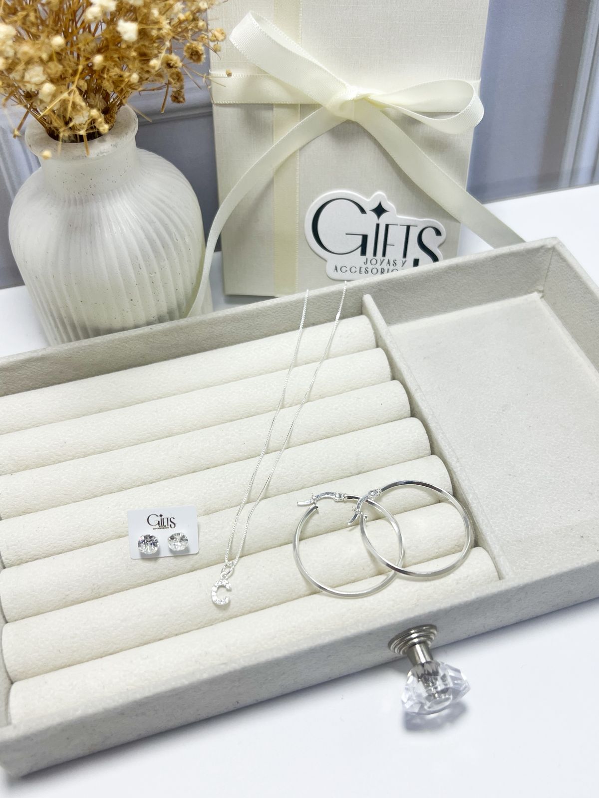 Topos con circones que aportan un toque de luz sutil y cómodo. Cadena con inicial personalizada , ideal para llevar siempre contigo lo que te representa. Candongas clásicas , livianas y versátiles, perfectas para cualquier ocasión.